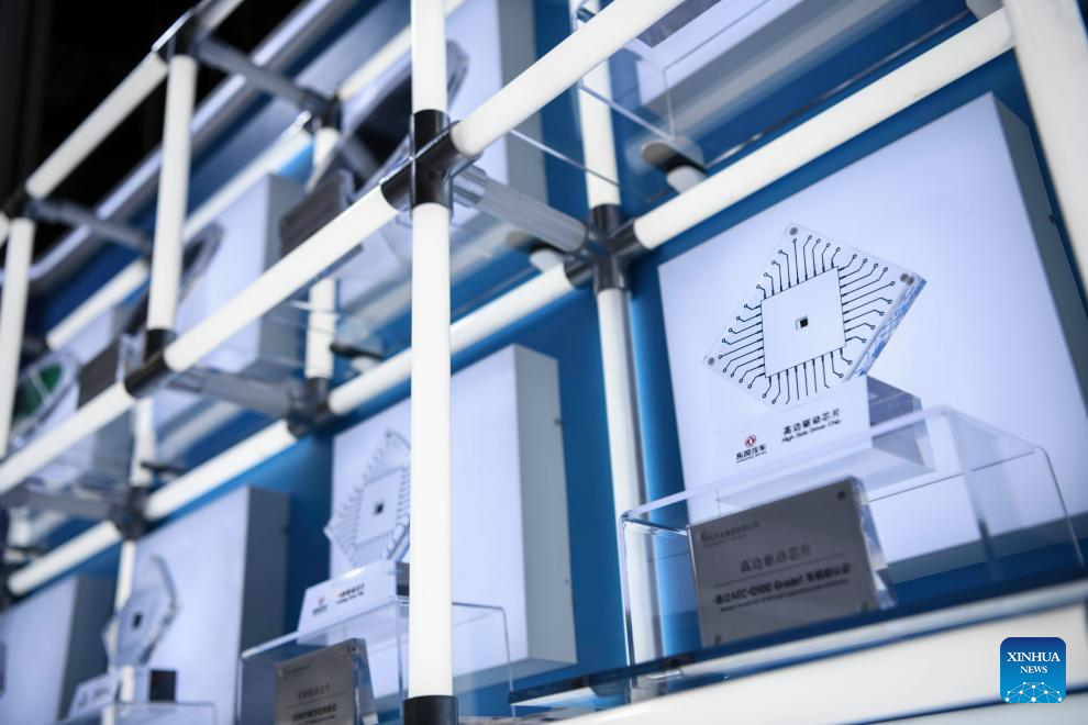 Chips are displayed at the exhibition area of central China's Hubei Province of the second China International Supply Chain Expo in Beijing, China, Nov. 27, 2024. As the province of honor for this year's expo, Hubei Province has invited 28 of its enterprises which showcased more than 70 exhibits during the event. (Xinhua/Zhang Haofu)