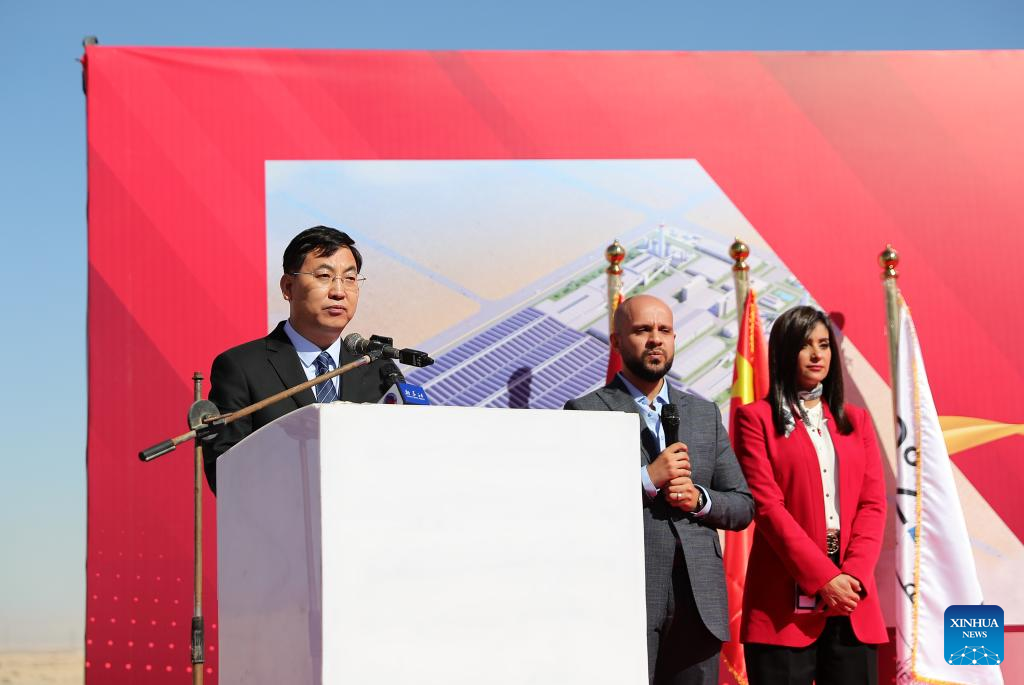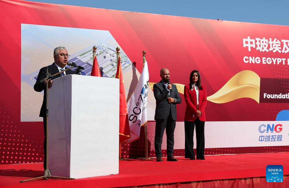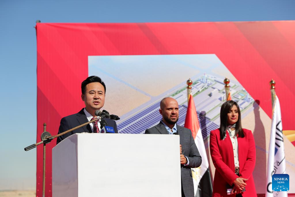 Cai Guo (L), vice president of China Glass Holdings Co., Ltd., speaks at a groundbreaking ceremony in the China-Egypt TEDA Suez Economic and Trade Cooperation Zone (TEDA), approximately 120 km east of Cairo, Egypt, Nov. 28, 2024.(Xinhua/Wang Dongzhen)