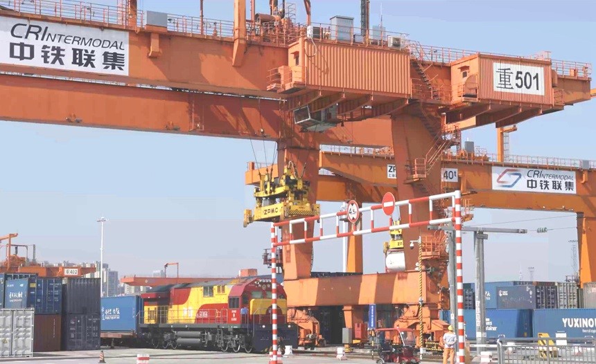 At Tuanjie Village Central Station in Chongqing's International Logistics Hub Park, trucks and cranes buzz with activity as trains arrive and depart frequently.
