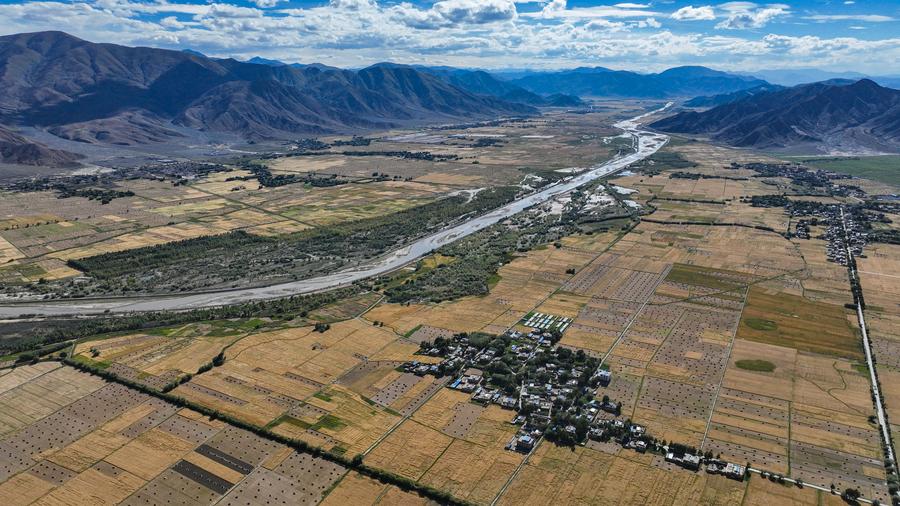 An aerial drone photo taken on Sept. 6, 2023 shows rural roads in Xigaze City, southwest China's Xizang Autonomous Region. (Xinhua/Jigme Dorje)