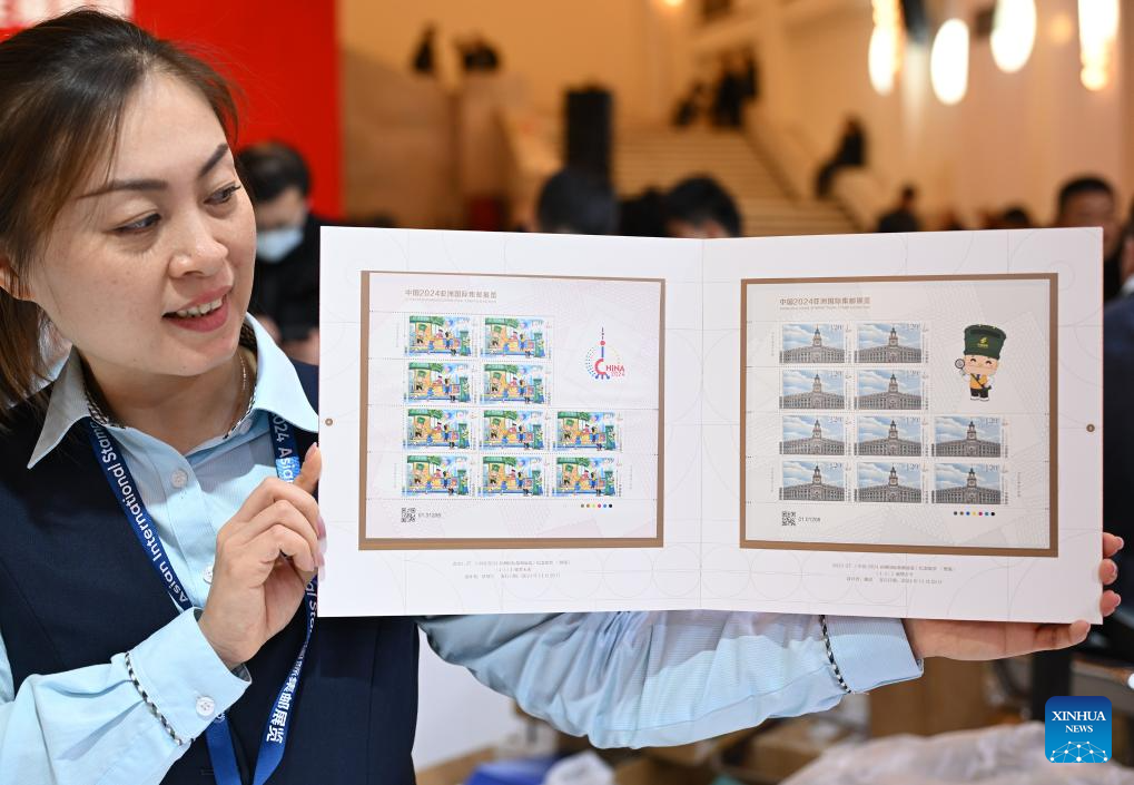 A staff member shows commemorative stamps issued by China Post for China 2024 Asian International Stamp Exhibition at Shanghai Exhibition Center in east China's Shanghai on Nov. 29, 2024. The exhibition opened on Friday and will last for 5 days. (Xinhua/Li He)