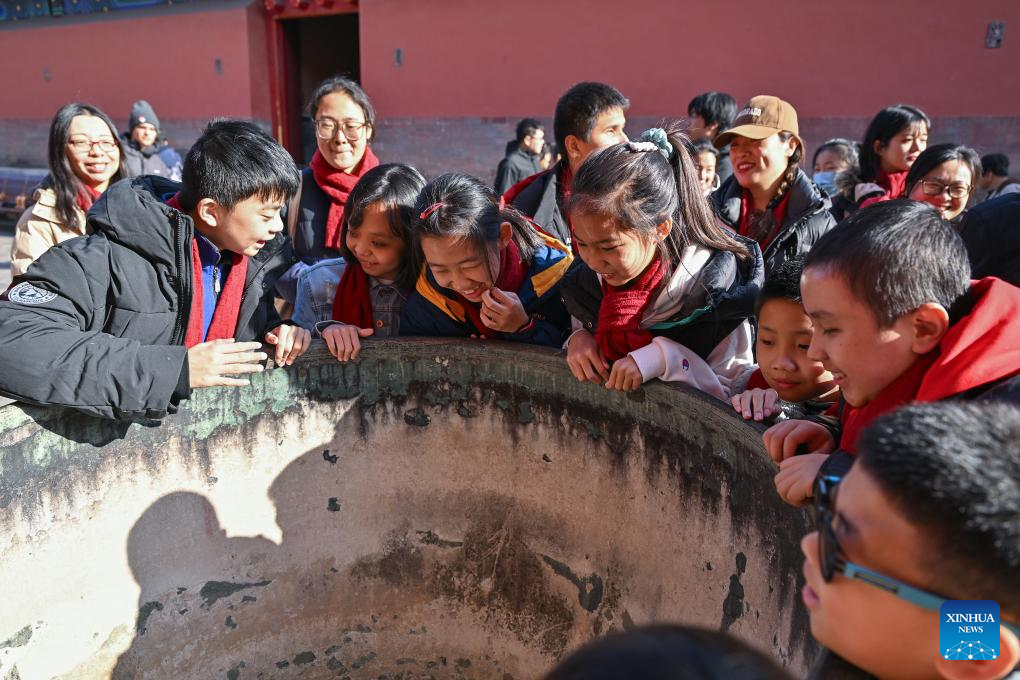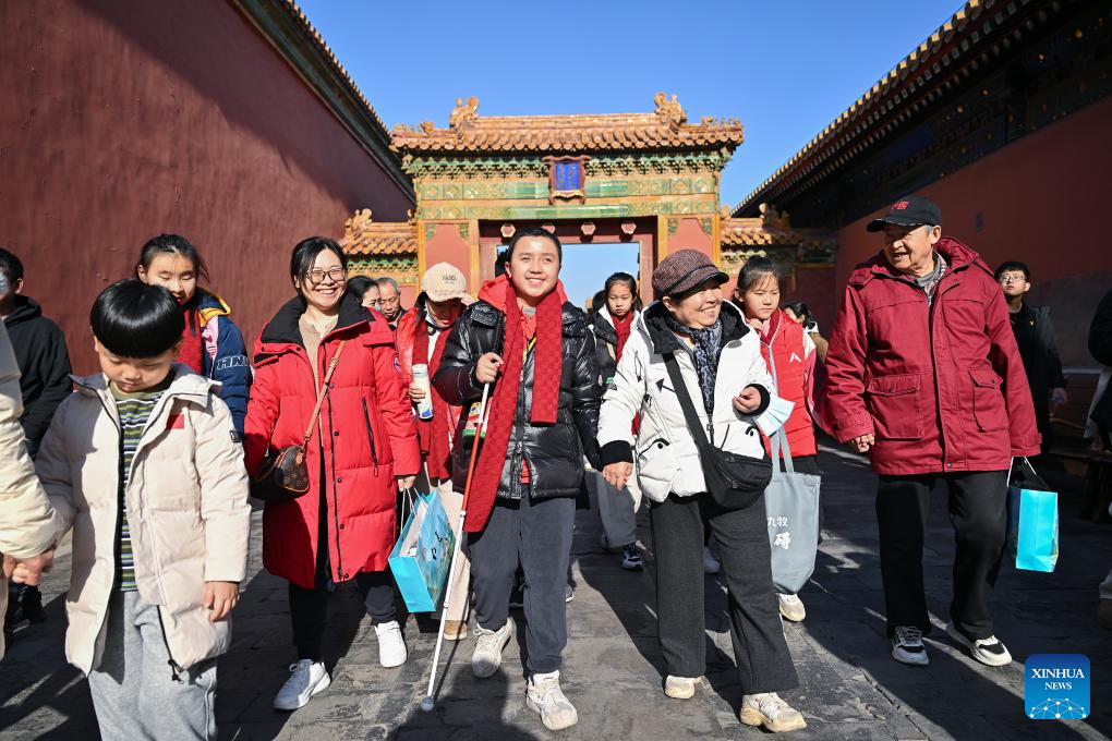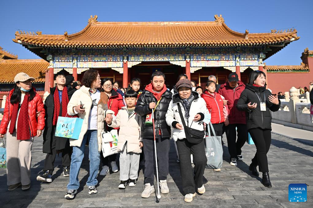 Students from the Beijing School for the Blind, together with their family members and volunteers, visit the Palace Museum in Beijing, capital of China, Dec. 1, 2024. Sensory Experience Gallery, co-founded by Palace Museum and China Disabled Persons' Federation, was inaugurated here on Sunday, featuring creative cultural works, cultural experiences, and study tours. It integrates multi-sensory experiences to make culture more accessible for people with disabilities. (Xinhua/Li Xin)