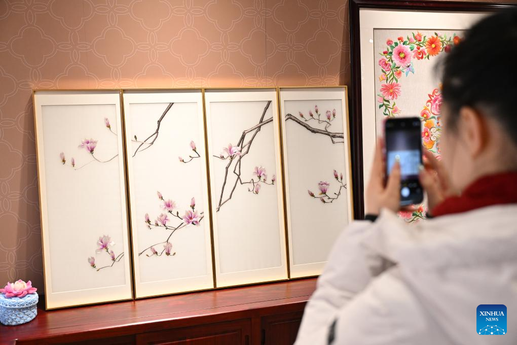 A visitor takes photos of creative cultural works made by intangible cultural heritage inheritors with disabilities at Sensory Experience Gallery of the Palace Museum in Beijing, capital of China, Dec. 1, 2024. Sensory Experience Gallery, co-founded by Palace Museum and China Disabled Persons' Federation, was inaugurated here on Sunday, featuring creative cultural works, cultural experiences, and study tours. It integrates multi-sensory experiences to make culture more accessible for people with disabilities. (Xinhua/Li Xin)