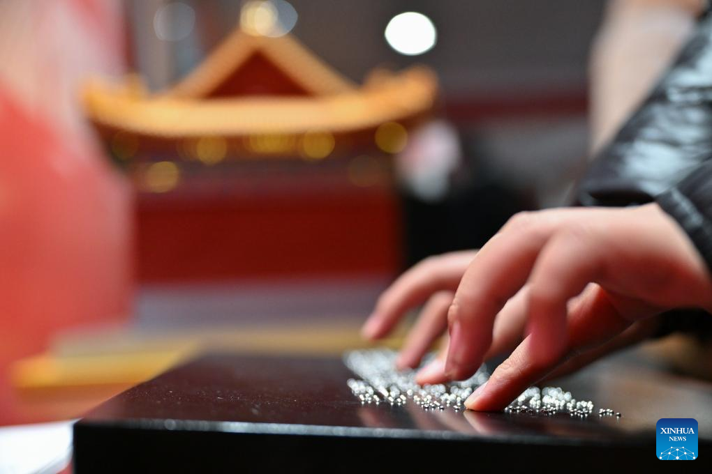 A student from the Beijing School for the Blind reads the braille version of introductions at Sensory Experience Gallery of the Palace Museum in Beijing, capital of China, Dec. 1, 2024. Sensory Experience Gallery, co-founded by Palace Museum and China Disabled Persons' Federation, was inaugurated here on Sunday, featuring creative cultural works, cultural experiences, and study tours. It integrates multi-sensory experiences to make culture more accessible for people with disabilities. (Xinhua/Li Xin)