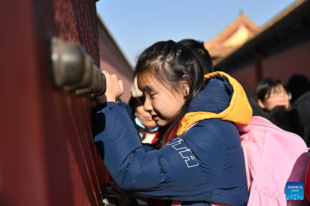 A student from the Beijing School for the Blind touches metal rivets of the door at the Palace Museum in Beijing, capital of China, Dec. 1, 2024. Sensory Experience Gallery, co-founded by Palace Museum and China Disabled Persons' Federation, was inaugurated here on Sunday, featuring creative cultural works, cultural experiences, and study tours. It integrates multi-sensory experiences to make culture more accessible for people with disabilities. (Xinhua/Li Xin)