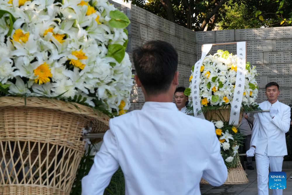 Staff members present flower baskets during the family commemoration for victims of the Nanjing Massacre in Nanjing, east China's Jiangsu Province, Dec. 1, 2024.(Xinhua/Li Bo)