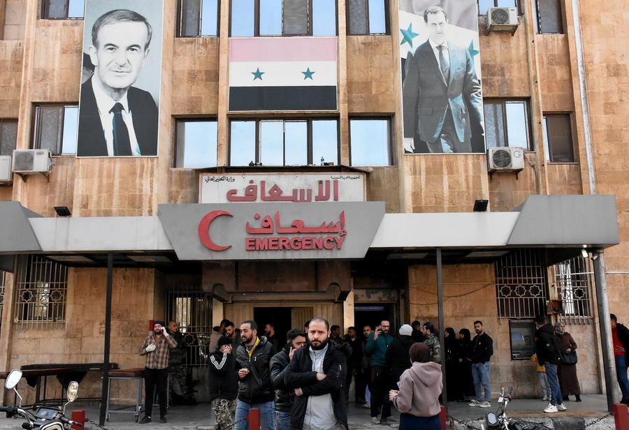 People wait outside a hospital after armed groups fired shells at a dormitory complex in Aleppo city, northern Syria, on Nov. 29, 2024. (Str/Xinhua)