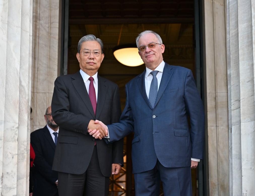 In talks with Tassoulas, Zhao said that, in conjunction with the implementation of the major strategic and development goals of both countries, the NPC of China is willing to work with the Greek parliament to strengthen friendly exchanges at all levels of the legislatures, learn from each other's experience in legislation and supervision in social governance, ecological protection and opening up, and timely approve or formulate legal documents conducive to bilateral cooperation.