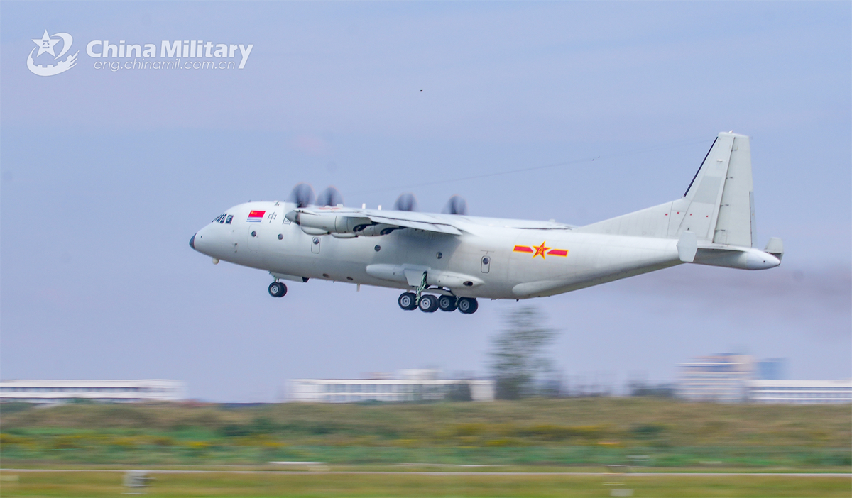 A Y-9 medium-lift transport aircraft attached to a naval aviation division under the Chinese PLA Eastern Theater Command takes off for flight training on November 4, 2024. (eng.chinamil.com.cn/Photo by Yu Mingzhe)