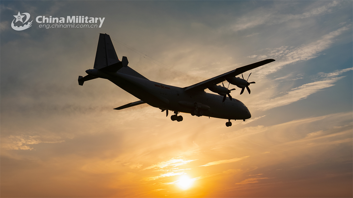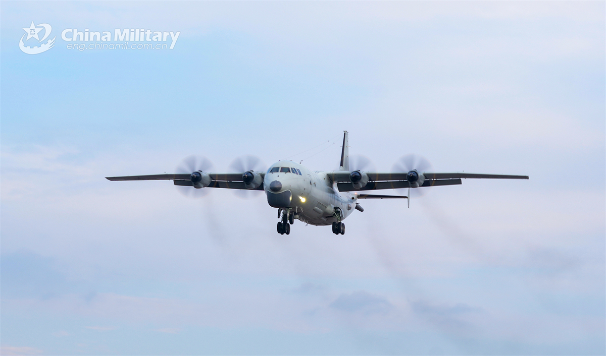 A Y-9 medium-lift transport aircraft attached to a naval aviation division under the Chinese PLA Eastern Theater Command unfolds its landing gears to prepare for landing during a flight training exercise on November 4, 2024. (eng.chinamil.com.cn/Photo by Yu Mingzhe)