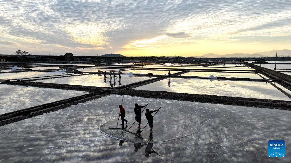 An aerial drone photo taken on Nov. 30, 2024 shows people working at a salt field in Quanzhou, southeast China's Fujian Province. (Photo by Wang Wangwang/Xinhua)