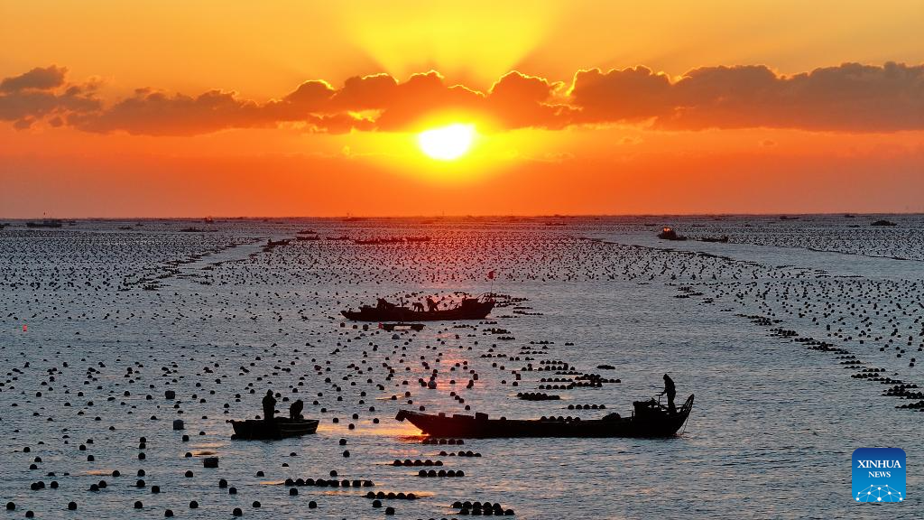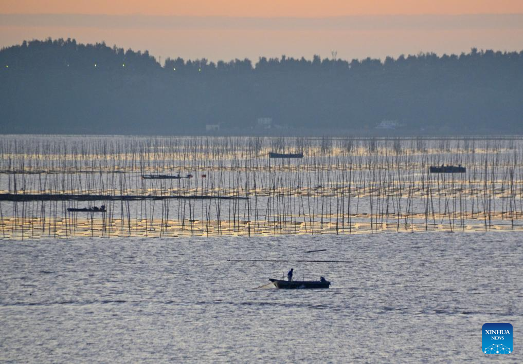 This photo taken on Nov. 30, 2024 shows a marine ranch in Xiajiaomen Village of Ganjiang Town, Yuhuan City, east China's Zhejiang Province. (Photo by Duan Junli/Xinhua)