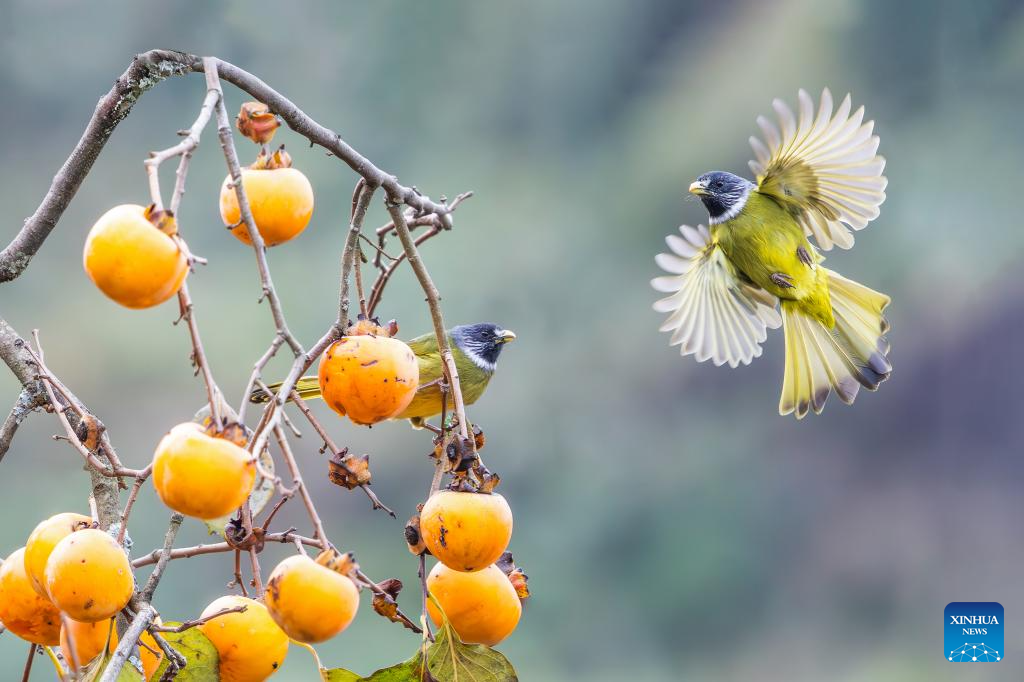 Birds rest on a persimmon tree branch in Yaowan Village of Sanquan Town, southwest China's Chongqing Municipality, Nov. 29, 2024. (Photo by Qu Mingbin/Xinhua)