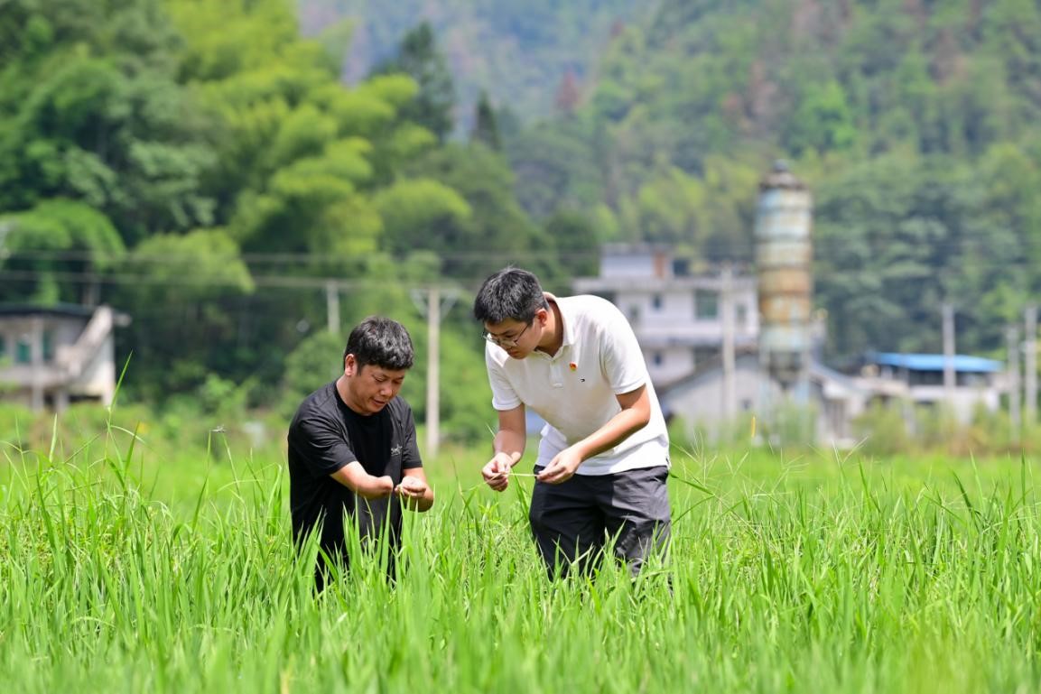 A poverty alleviation official (right) instructs a local villager to deal with rice diseases and insect pests in Miwang village, Mawang township, Youyang Tujia and Miao autonomous county, southwest China's Chongqing municipality, Aug. 3, 2023. (People's Daily Online/Qiu Hongbin)