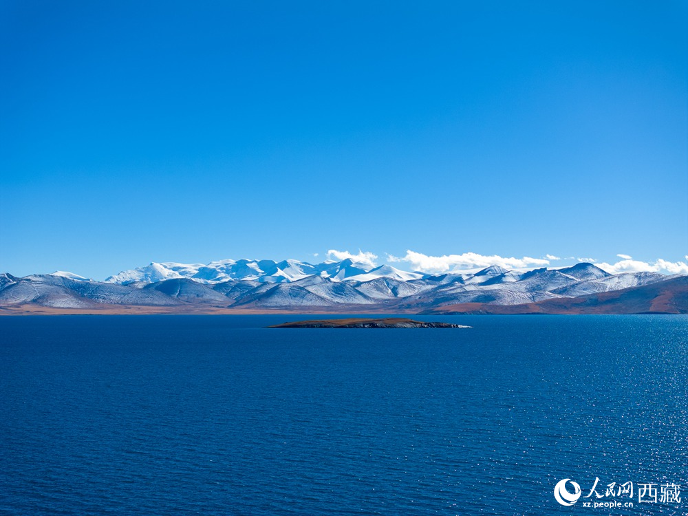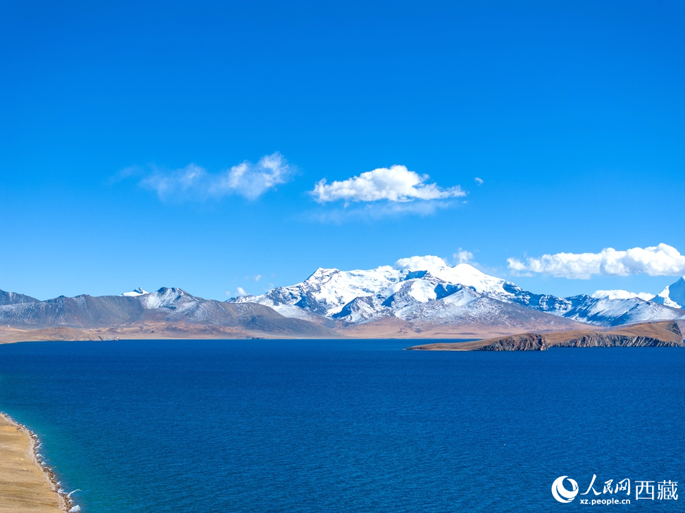 A snow-rimmed Phuma Yumtso Lake glimmers in Xizang's winter landscape. (People's Daily/Xu Yuyao)