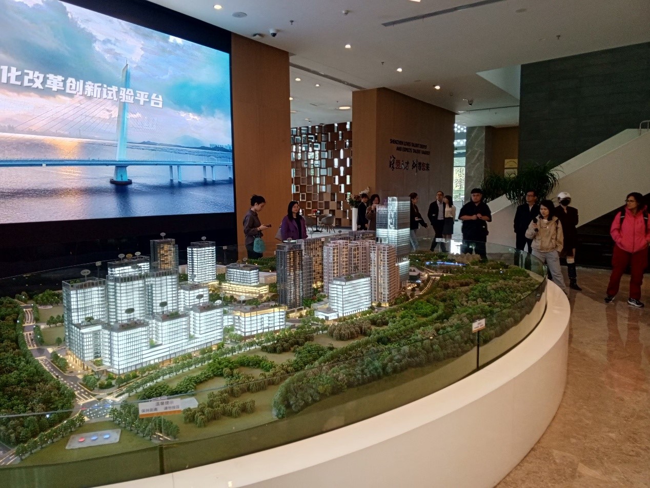 The model of the Hong Kong-Shenzhen Innovation and Technology Park hosted at the management building of the park reveals the huge size of the complex dedicated to Life & Health Technology, AI & Data Science, New Energy, New Materials, Microelectronics and Robotics research and development, Longgang district, Shenzhen, south China's Guangdong Province, Nov. 25, 2024. (Photo/People’s Daily Online)