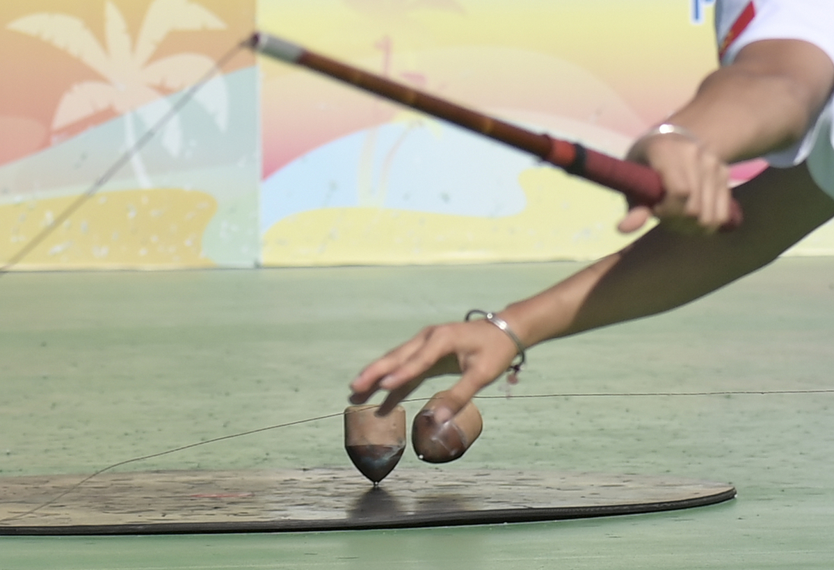 An athlete attempts to keep the Tuoluo spinning for extended periods at the 12th National Traditional Games of Ethnic Minorities of the People's Republic of China on Nov 27, 2024, in Sanya, South China's Hainan province. (Photo/Xinhua)