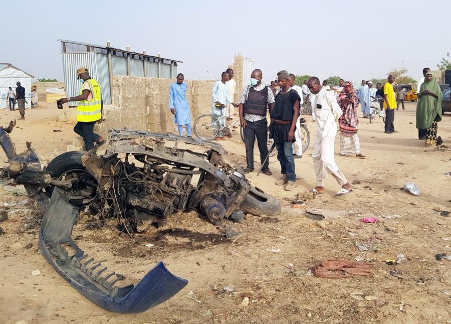Photo taken on April 27, 2018 shows a wreckage of a vehicle after a bomb attack by Boko Haram militia in Maiduguri, Nigeria, April 27, 2018. (Xinhua/NAN)