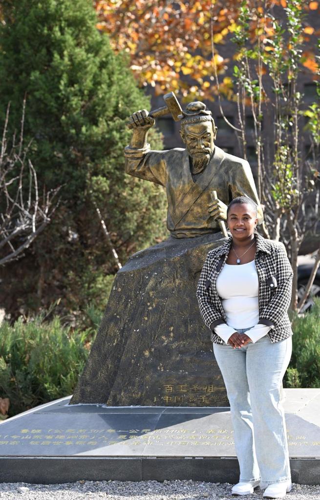 Kalkidan poses for a photo in front of the sculpture of Lu Ban, the revered Chinese artisan, at the Tianjin University of Technology and Education in Tianjin, north China, Nov. 22, 2024. (Xinhua/Li Ran)