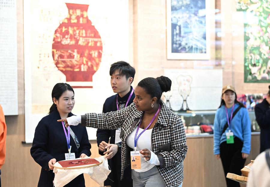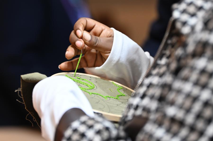 Kalkidan tries traditional Chinese embroidery at the 2024 World Vocational and Technical Education Development Conference in Tianjin, north China, Nov. 22, 2024. (Xinhua/Li Ran)