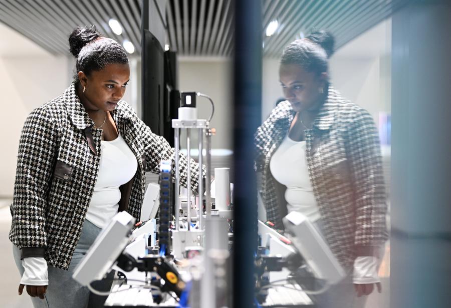 Kalkidan views a set of equipment at the Tianjin University of Technology and Education in Tianjin, north China, Nov. 22, 2024. (Xinhua/Li Ran)