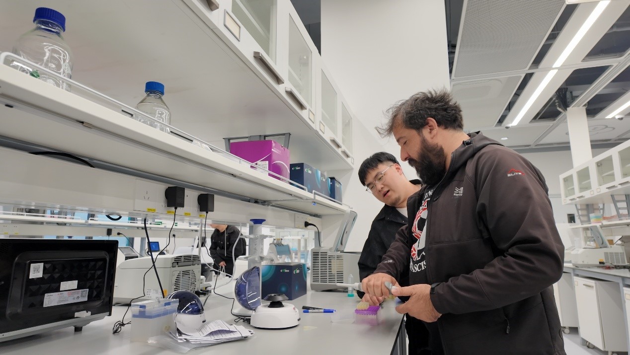 Dr. Konstantinos E. Papathanasiou, a foreign expert at People's Daily Online, is also an accomplished bioinorganic chemistry researcher. As nominee for the prestigious Marie Sk?odowska-Curie Individual Fellowship (MSCA-IF) by the European Research Council, he has contributed to numerous scientific projects across the U.S., Russia, Germany, and the U.K. In this photo, taken at SMART's demo lab, he explains the operation of Eppendorf pipettes to one of his colleagues in Guangming district, Shenzhen, south China's Guangdong Province, Nov. 29, 2024. (Photo/People's Daily Online)