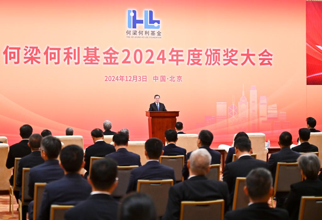 Chinese Vice Premier Ding Xuexiang, also a member of the Standing Committee of the Political Bureau of the Communist Party of China Central Committee, addresses an award ceremony held by the Hong Kong-based Ho Leung Ho Lee Foundation in Beijing, capital of China, Dec. 3, 2024. (Xinhua/Yan Yan)
