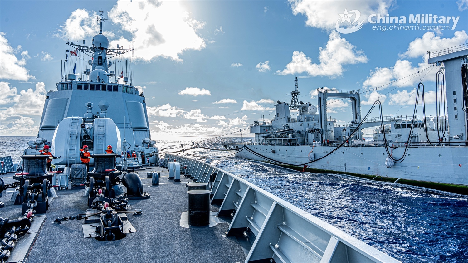 A destroyer and a comprehensive supply ship attached to a naval fleet of the Chinese People's Liberation Army (PLA) conduct the alongside replenishment operation during a replenishment-at-sea training exercise on November 8, 2024. (eng.chinamil.com.cn/Photo by Wan Haichao)