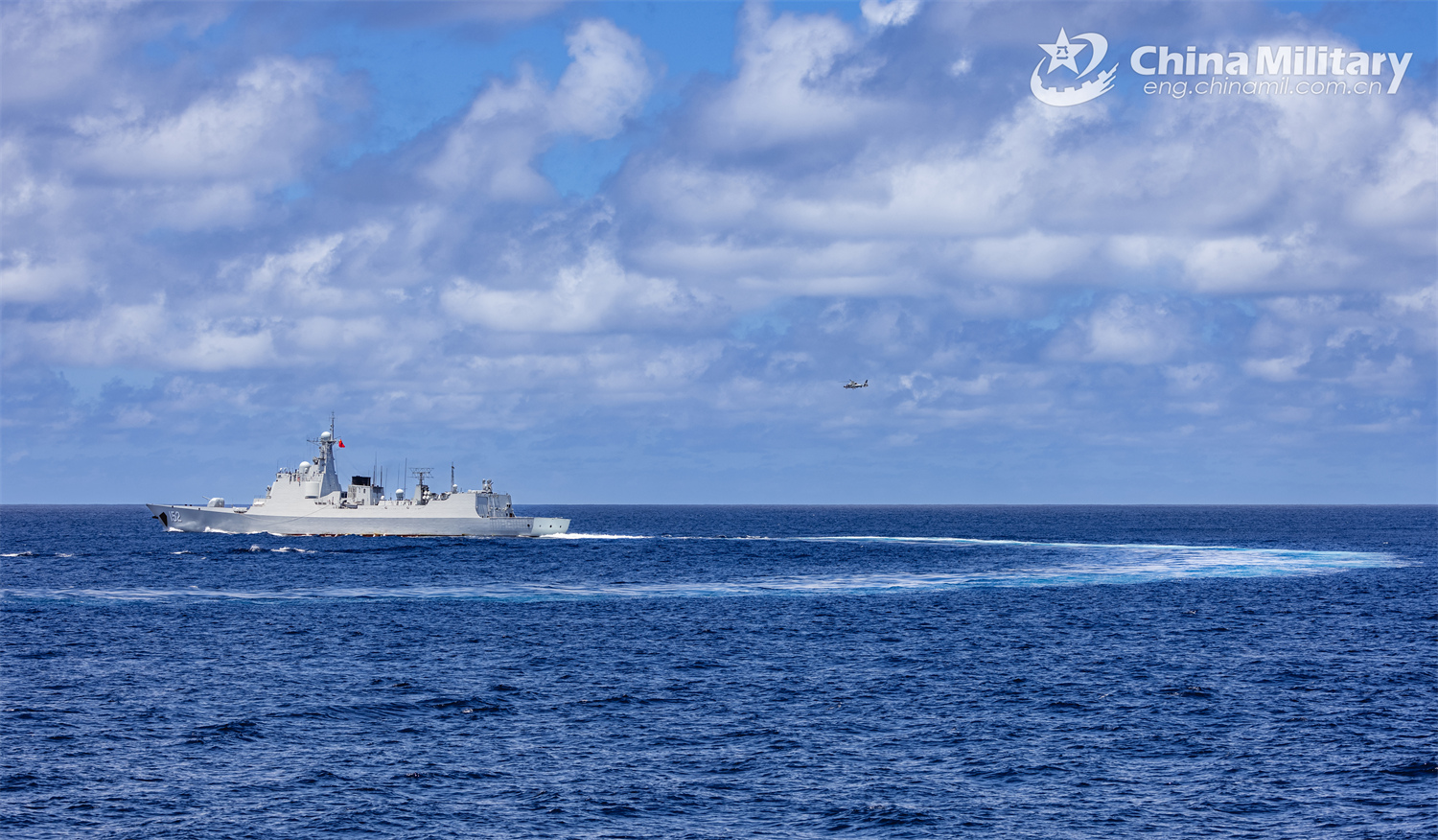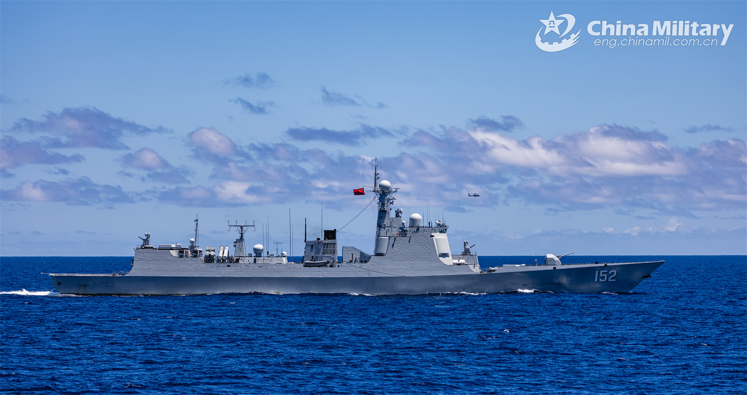 Type 052C guided-missile destroyer Jinan (Hull 152) attached to a naval fleet of the Chinese People's Liberation Army (PLA) coordinates with a helicopter during a replenishment-at-sea training exercise on November 8, 2024. (eng.chinamil.com.cn/Photo by Wan Haichao)