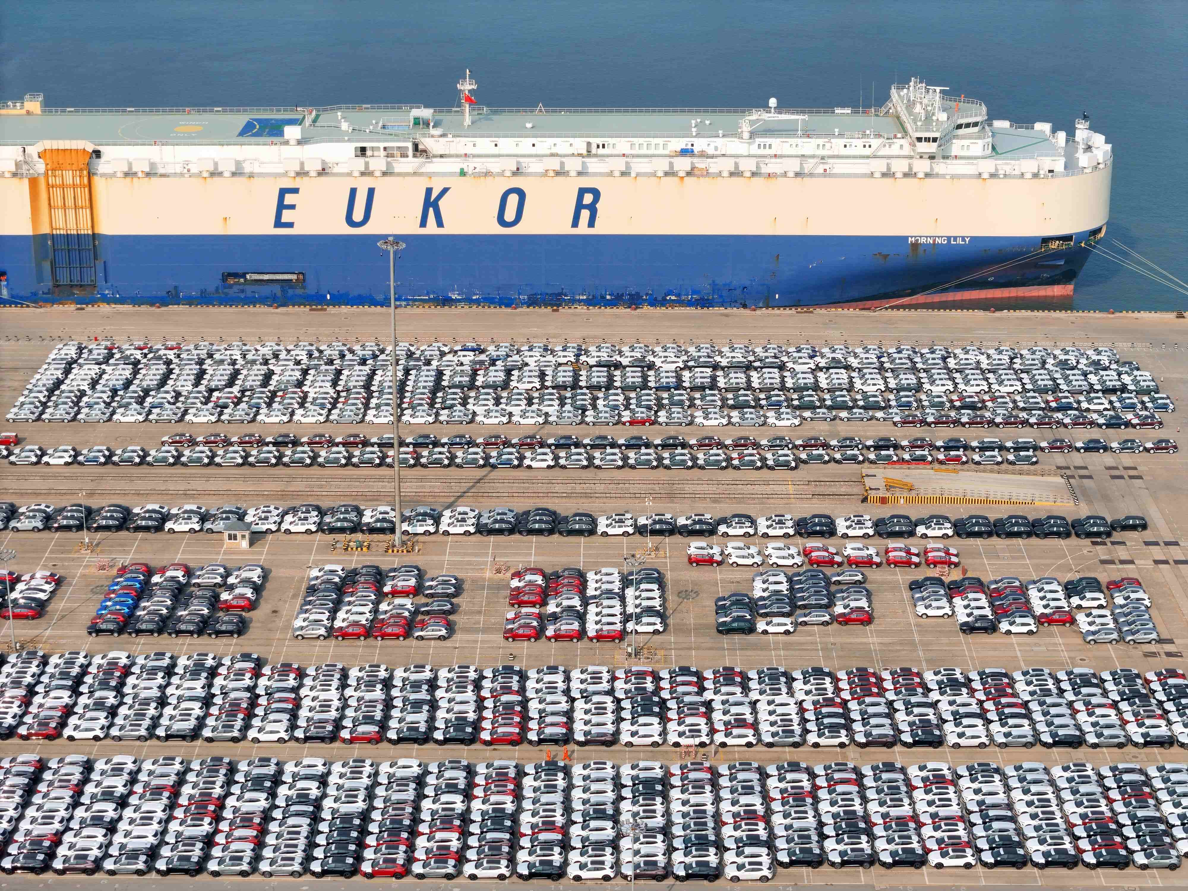 Chinese-manufactured vehicles are waiting to be exported at the Yantai Port in Yantai, east China's Shandong province, Nov. 20, 2024. (People's Daily Online/Tang Ke)