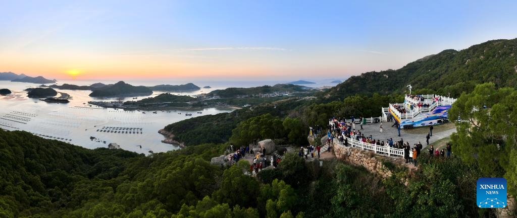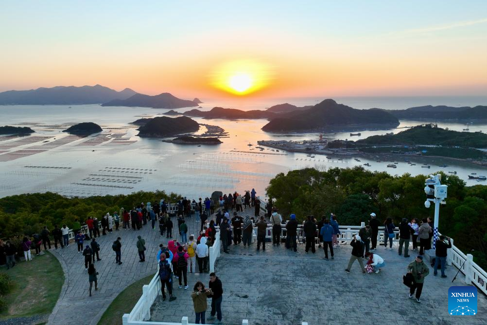 An aerial panoramic drone photo shows tourists enjoying the sunrise scenery in Huazhu Village of Sansha Town in Xiapu County, southeast China's Fujian Province, Nov. 29, 2024.