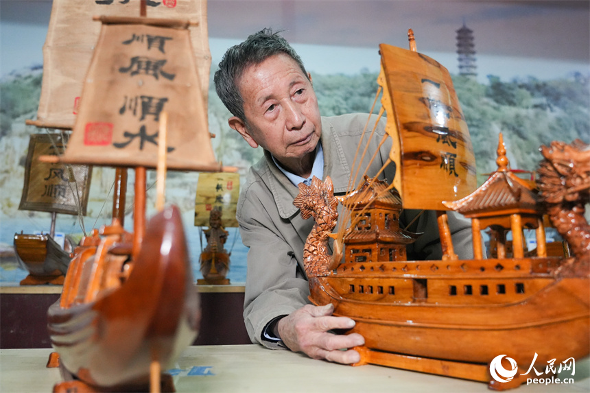 Liu Xinglin shows a ship model. (People's Daily Online/Kong Wenjin)