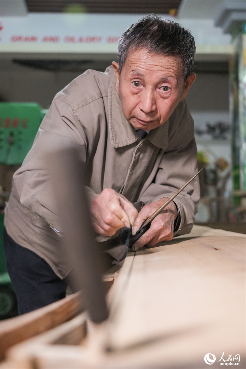 Liu Xinglin works on a wooden ship component. (People's Daily Online/Kong Wenjin)
