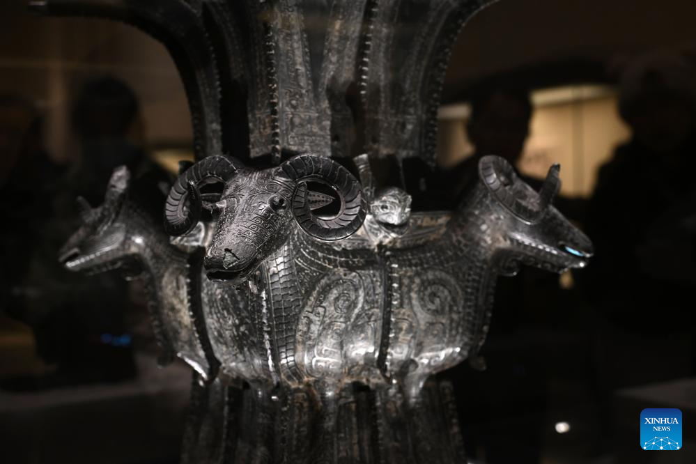 This photo shows the square vessel with four rams from the Shang Dynasty (1600-1046 BC) exhibited at the National Museum of China in Beijing, capital of China, Dec. 3, 2024.