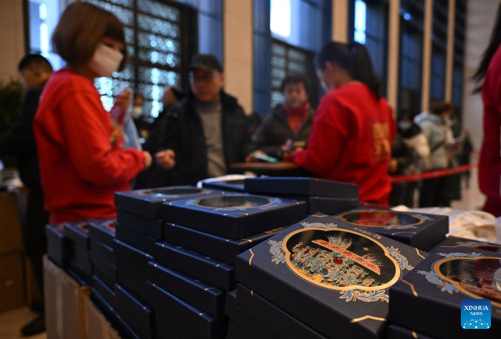 Visitors wait in line to buy "Queen's Crown"-themed refrigerator stickers at a souvenir shop of the National Museum of China in Beijing, capital of China, Dec. 3, 2024.