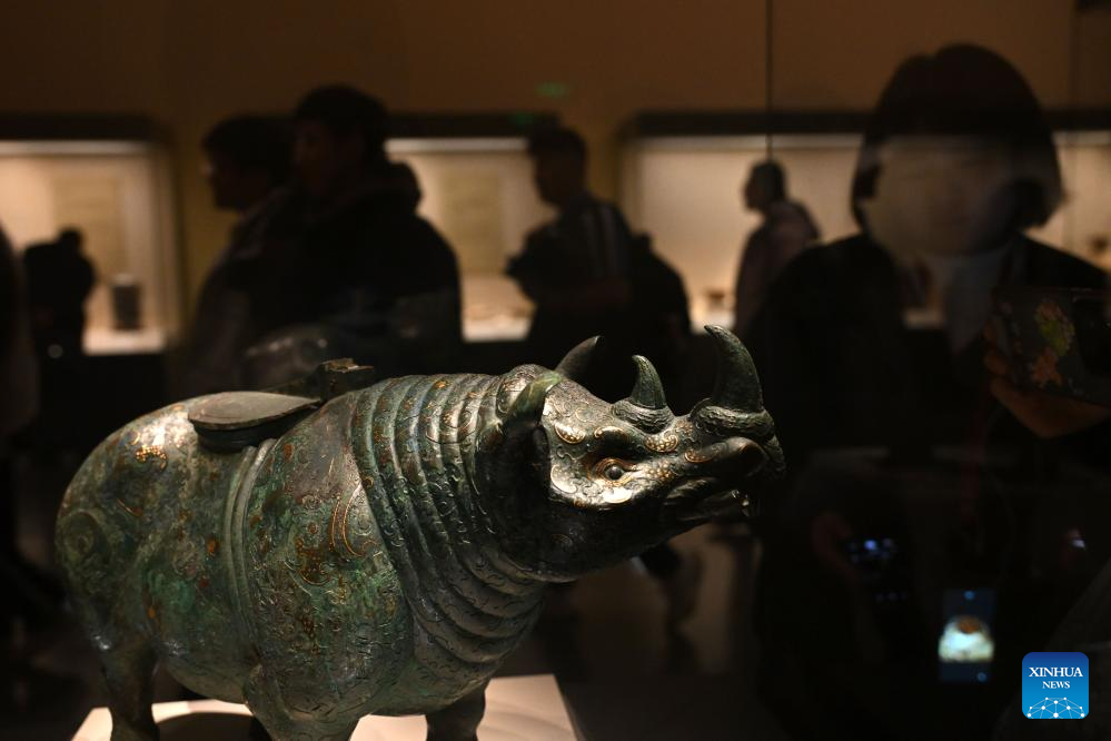 Visitors view a rhinoceros-shaped bronze zun (wine vessel) from the Western Han Dynasty (202 BC-25 AD) at the National Museum of China in Beijing, capital of China, Dec. 3, 2024.