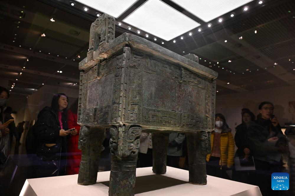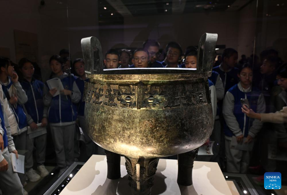 Visitors view a "Yu" bronze ding (food container) from the Western Zhou Dynasty (1046-771 BC) at the National Museum of China in Beijing, capital of China, Dec. 3, 2024.
