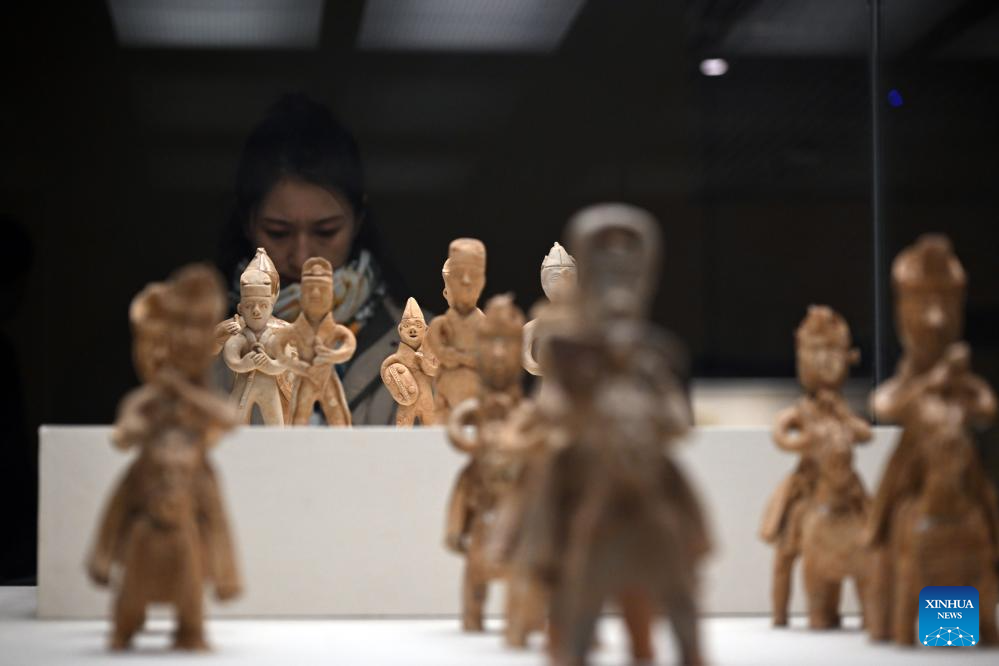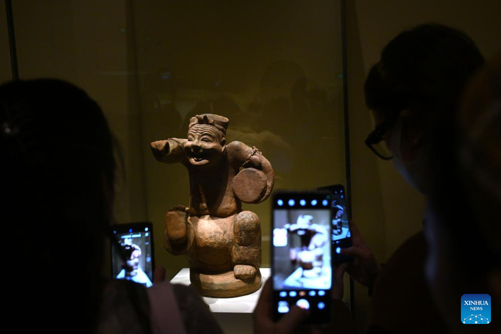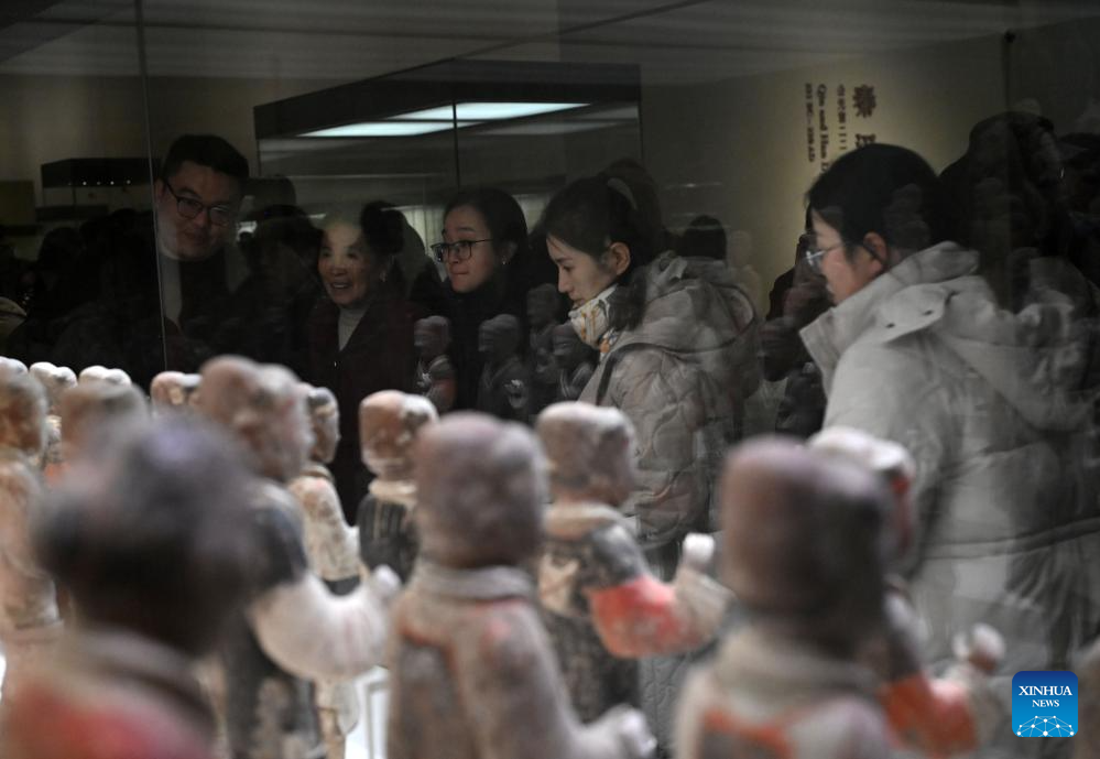 Visitors view a drum-beating pottery storyteller from the Eastern Han Dynasty (25-220) at the National Museum of China in Beijing, capital of China, Dec. 3, 2024.