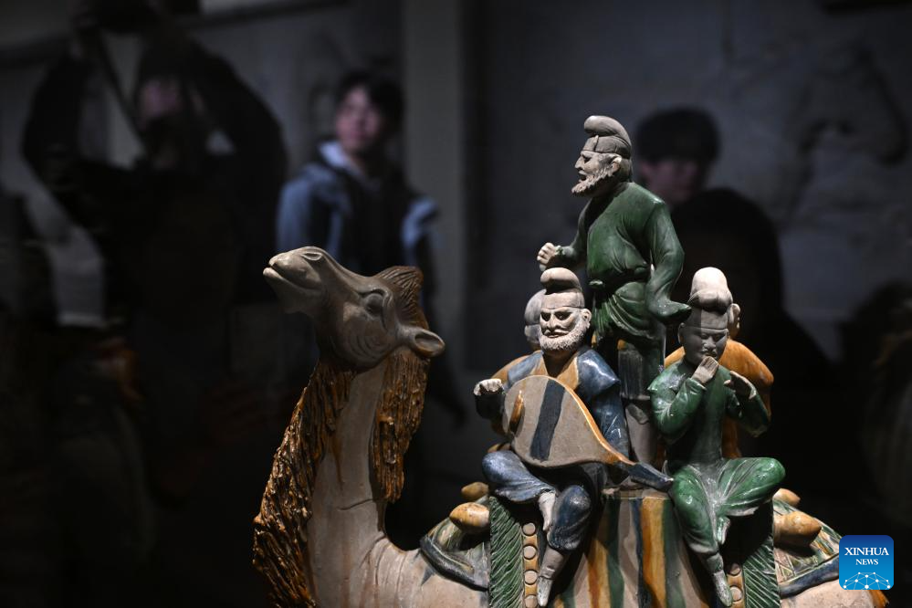 Visitors view a Sancai-glazed pottery musicians on camelback from the Tang Dynasty (618-907) at the National Museum of China in Beijing, capital of China, Dec. 3, 2024.
