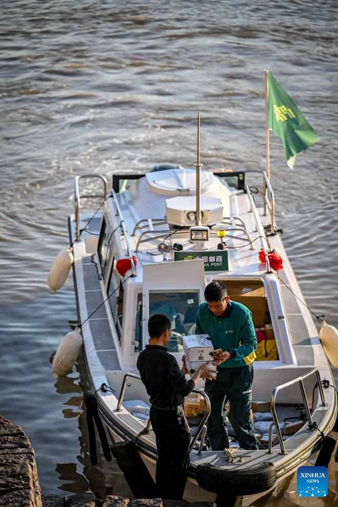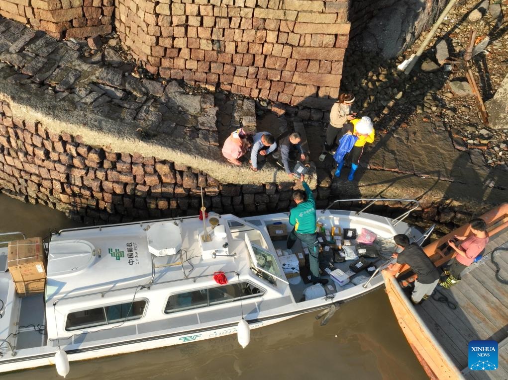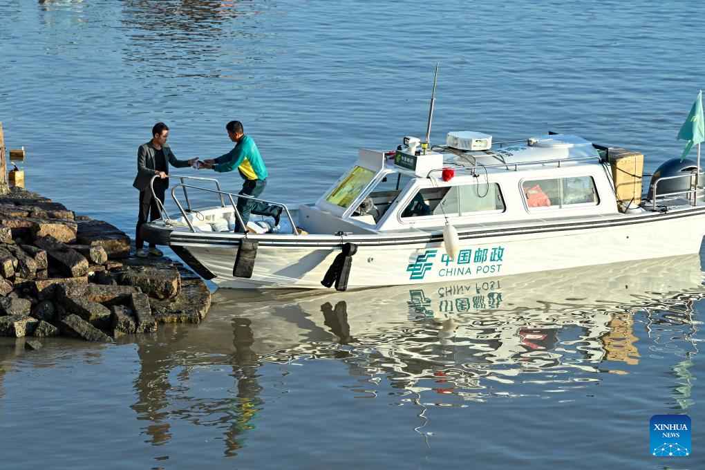 Shi Jinquan delivers packages at a dock of Xiadangwei Village of Sandu Town, Ningde City, southeast China's Fujian Province, Dec. 2, 2024. (Xinhua/Jiang Kehong)