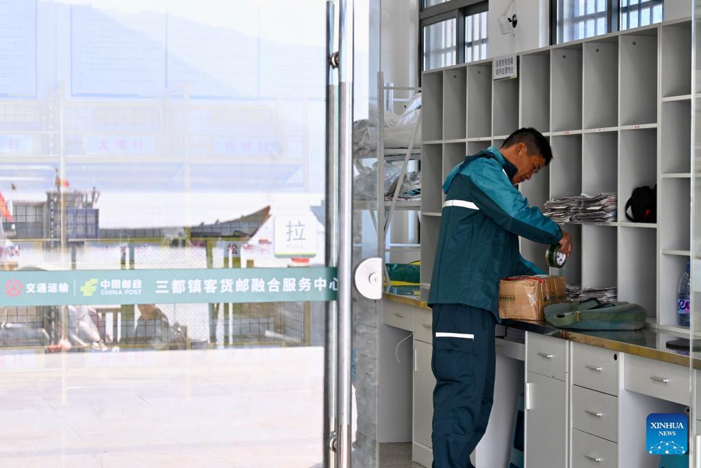 Shi Jinquan packs parcels at a postal service center of Sandu Town, Ningde City, southeast China's Fujian Province, Dec. 2, 2024. (Xinhua/Zhang Cheng)