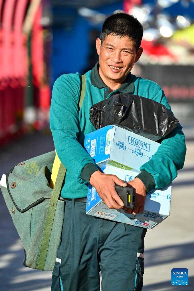 Shi Jinquan delivers packages in Xiadangwei Village of Sandu Town, Ningde City, southeast China's Fujian Province, Dec. 2, 2024. (Xinhua/Zhang Cheng)