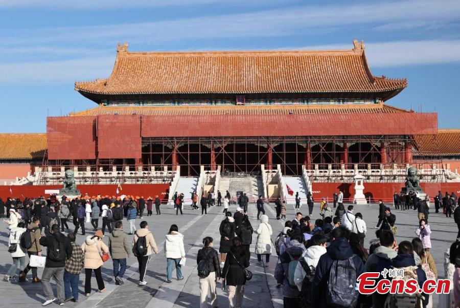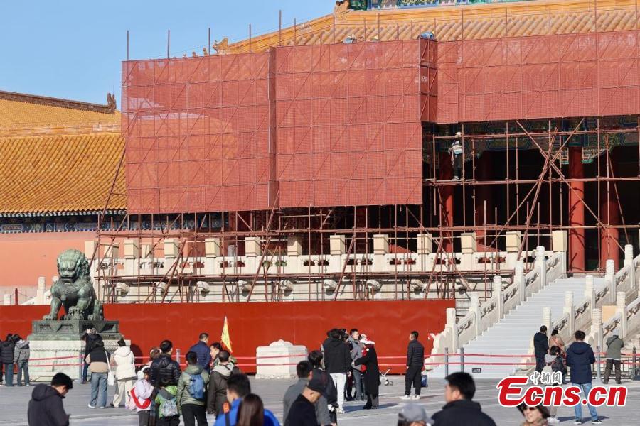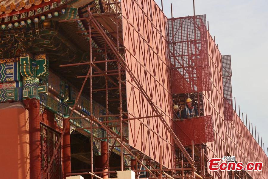 Construction workers restore Taihe Gate (The Gate of Supreme Harmony), the main gate of the palace outside the Palace Museum, in Beijing, Dec. 4, 2024. (China News Service/Yi Haifei)