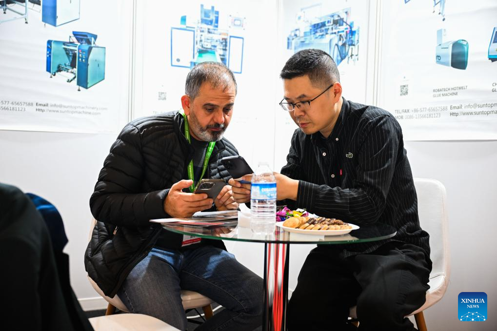 A visitor talks with a Chinese exhibitor at China Plastics Industry (Türkiye) Brand Exhibition in Istanbul, Türkiye, Dec. 4, 2024. The four-day-long exhibition opened here on Wednesday and is held in parallel with the Plast Eurasia Istanbul 2024. (Xinhua/Liu Lei)