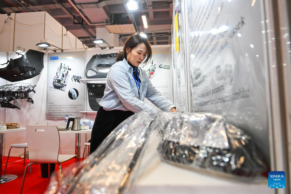 A staff member organizes exhibits at China Plastics Industry (Türkiye) Brand Exhibition in Istanbul, Türkiye, Dec. 4, 2024. The four-day-long exhibition opened here on Wednesday and is held in parallel with the Plast Eurasia Istanbul 2024. (Xinhua/Liu Lei)