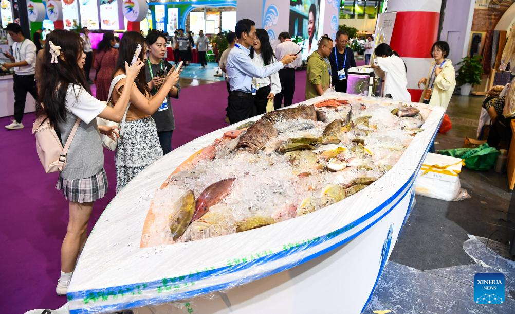 Visitors take photos of seafood at the 27th China (Hainan) International Winter Trade Fair for Tropical Agricultural Products in Haikou, south China's Hainan Province, Dec. 5, 2024. The trade fair opened here on Thursday. (Xinhua/Yang Guanyu)