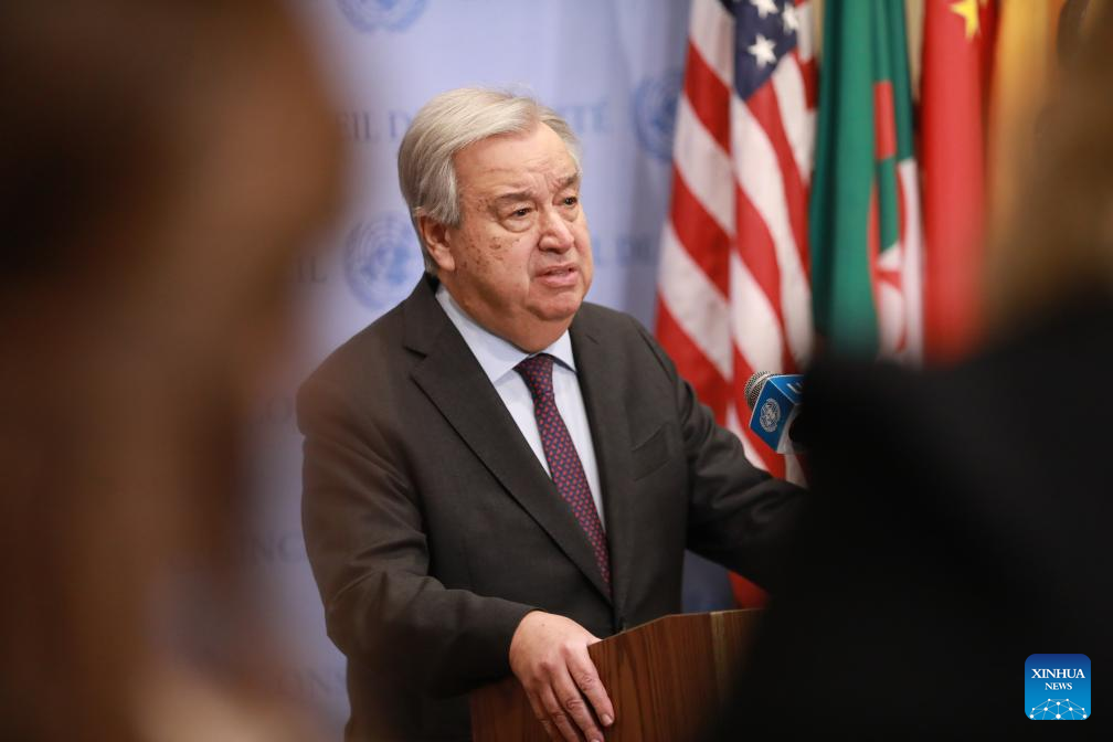 UN Secretary-General Antonio Guterres speaks to the press outside the Security Council Chamber at the UN headquarters in New York, on Dec. 5, 2024. Guterres on Thursday called for immediate humanitarian access to all civilians in Syria, and a return to political process to end the bloodshed. (Xinhua/Xie E)