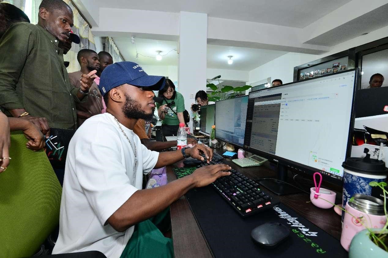 International students from the Democratic Republic of the Congo and Equatorial Guinea join an e-commerce training program hosted by a trade company in Yiwu, east China's Zhejiang province, Aug. 30, 2024. (People's Daily Online/Lyu Bin)