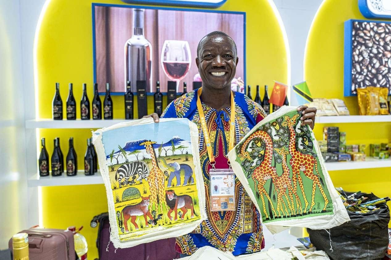 A staff member with the Tanzania Pavilion at the seventh China International Import Expo (CIIE) poses for a picture with local artworks, Nov. 6, 2024. (People's Daily Online/Wang Chu)