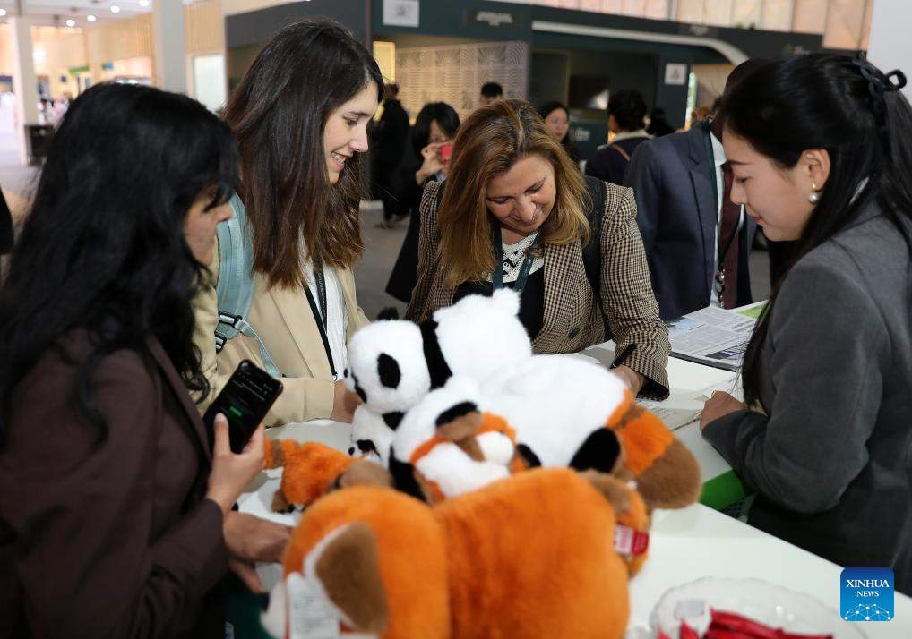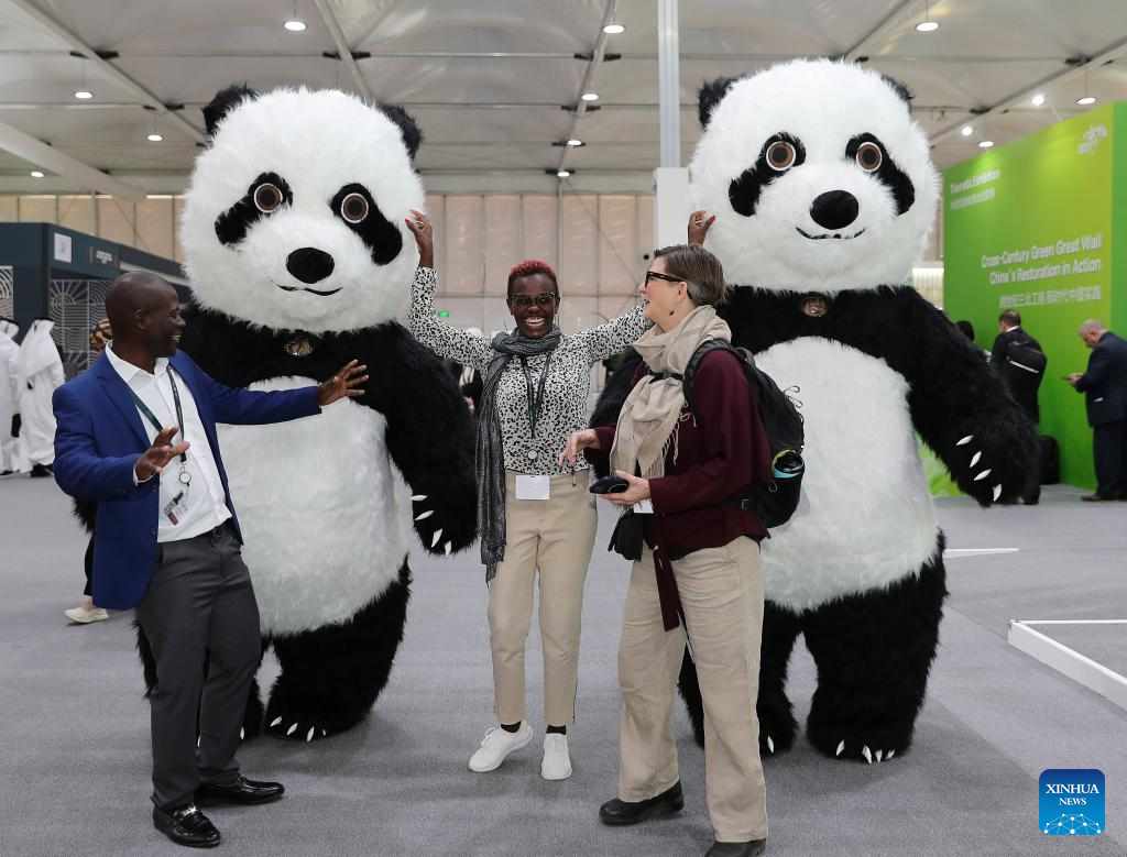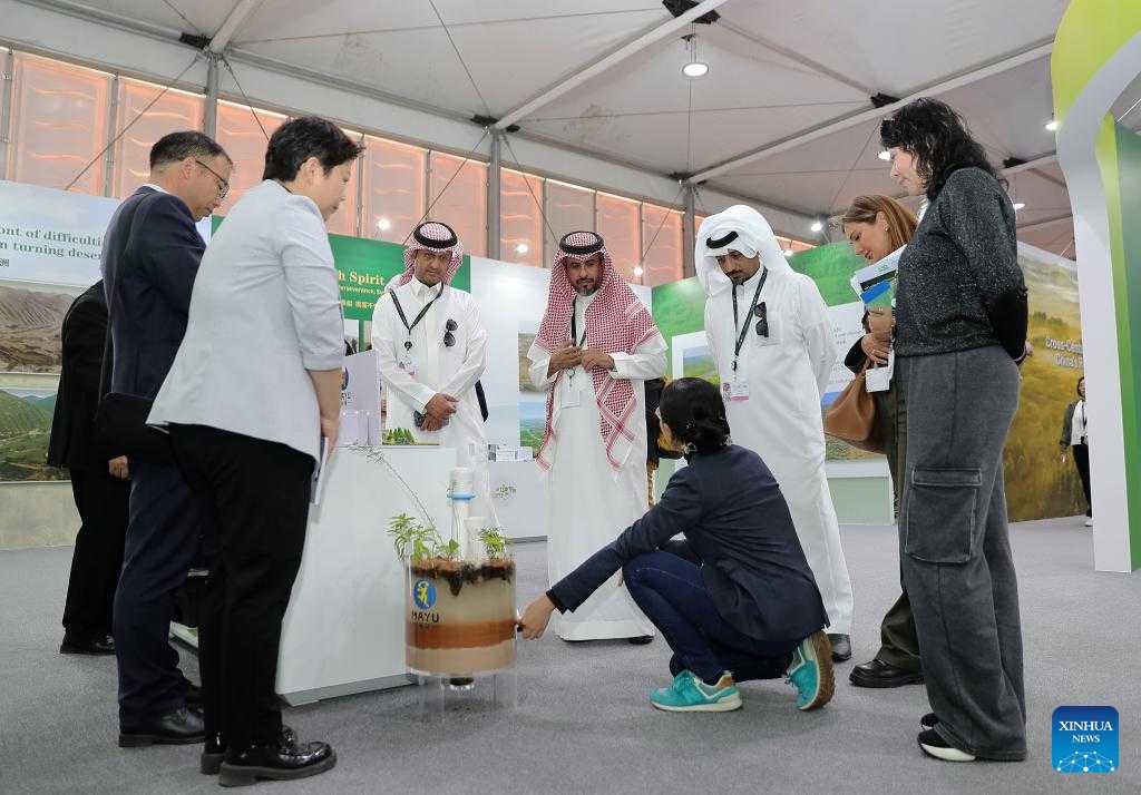 People visit the China Pavilion during the 16th Conference of the Parties (COP16) to the United Nations Convention to Combat Desertification (UNCCD) in Riyadh, Saudi Arabia, on Dec. 4, 2024. Covering more than 600 square meters, the China Pavilion is the second-largest national pavilion at the event. Its exhibition, themed "Cross-Century Green Great Wall, China's Restoration in Action," showcases the nation's battle against desertification, particularly through the Three-North Shelter Forest Program, a major national initiative aimed at reversing land desertification. (Xinhua/Wang Dongzhen)